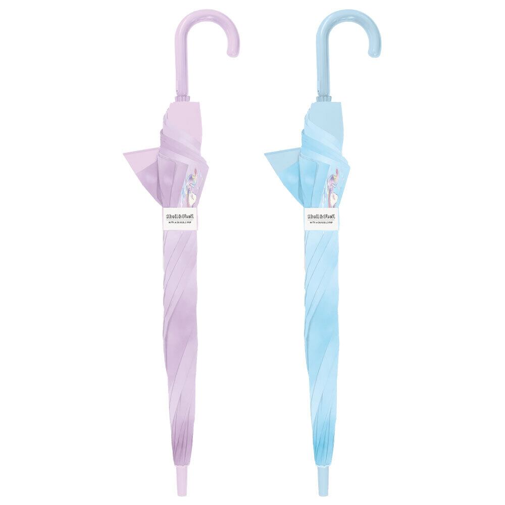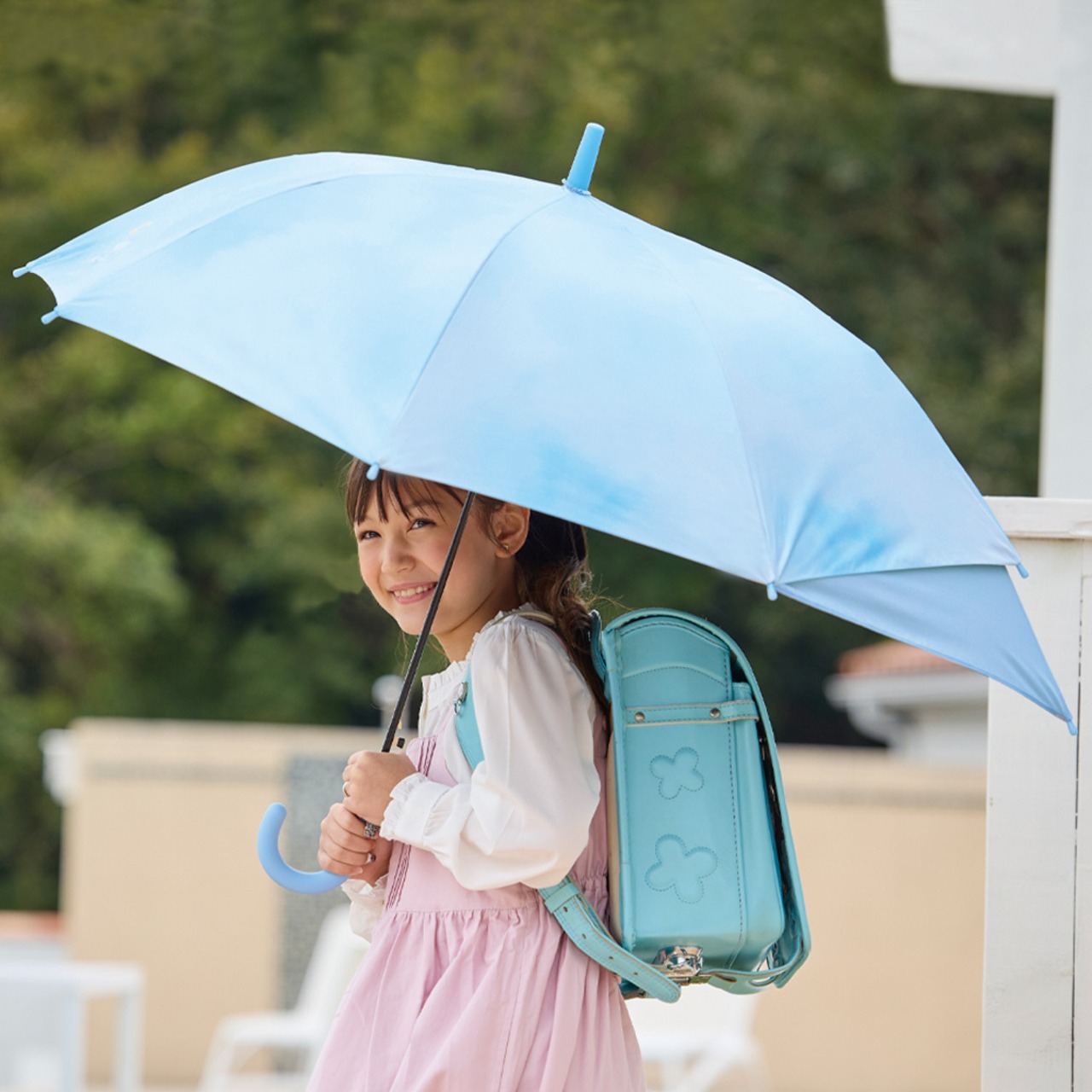 傘を開くと後ろに大きく広がる特殊骨構造!ランドセルなど背中の荷物を雨から守ります。横幅は通常サイズと変わらないのでかさばりません。