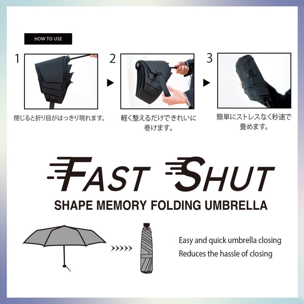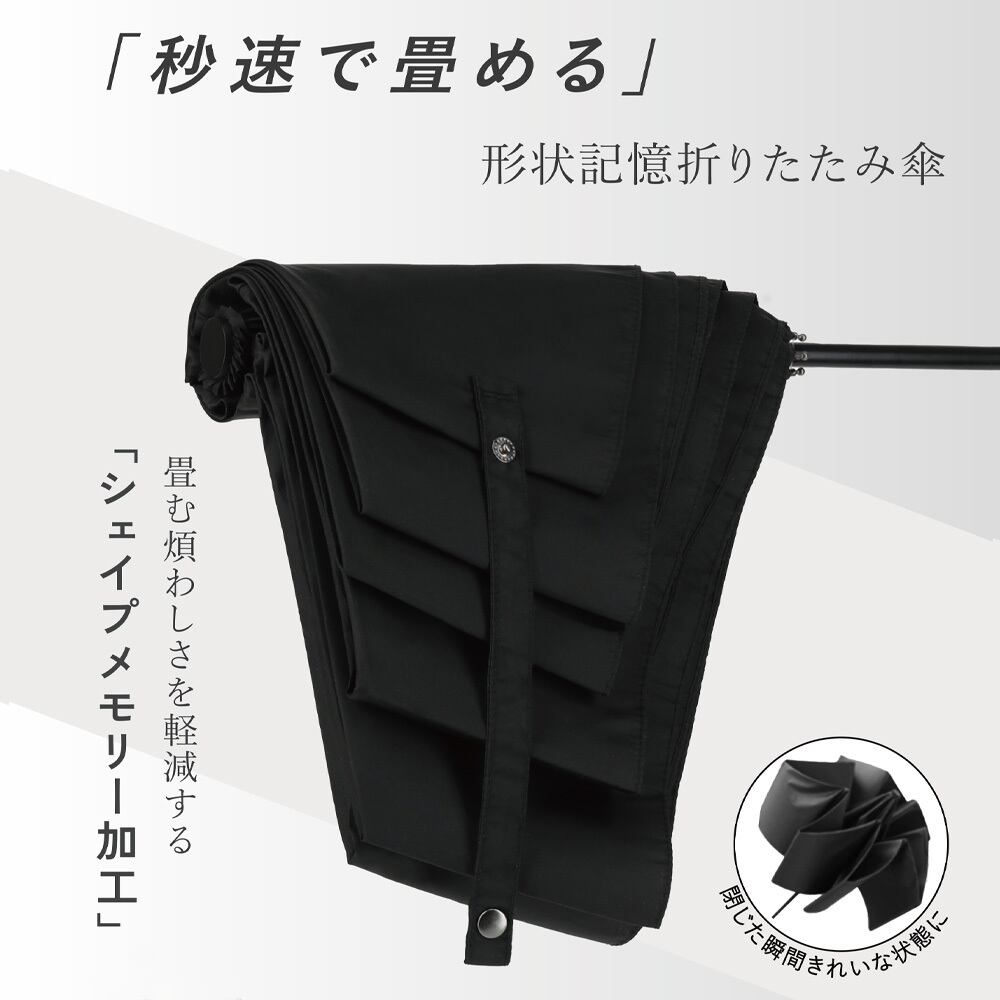 ボタンのワンプッシュで自動開閉ができる晴雨兼用傘。折り畳み傘の畳む煩わしさを解消する、シェイプメモリー生地を使用!