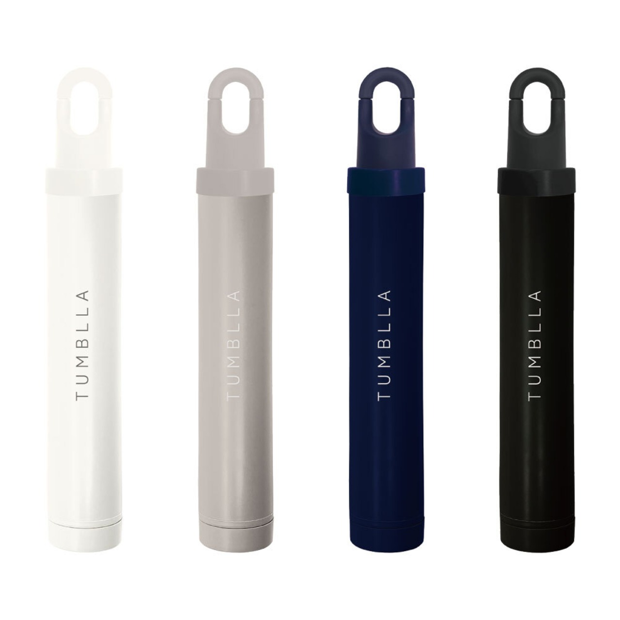 バッグの持ち手に取り付け可能なカラビナタイプです。収納時もバッグが濡れない、スリムボトル付き。