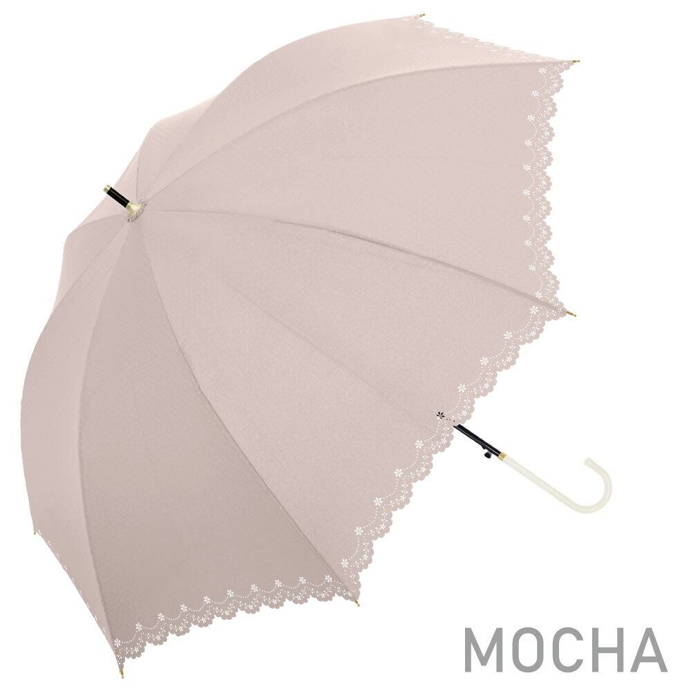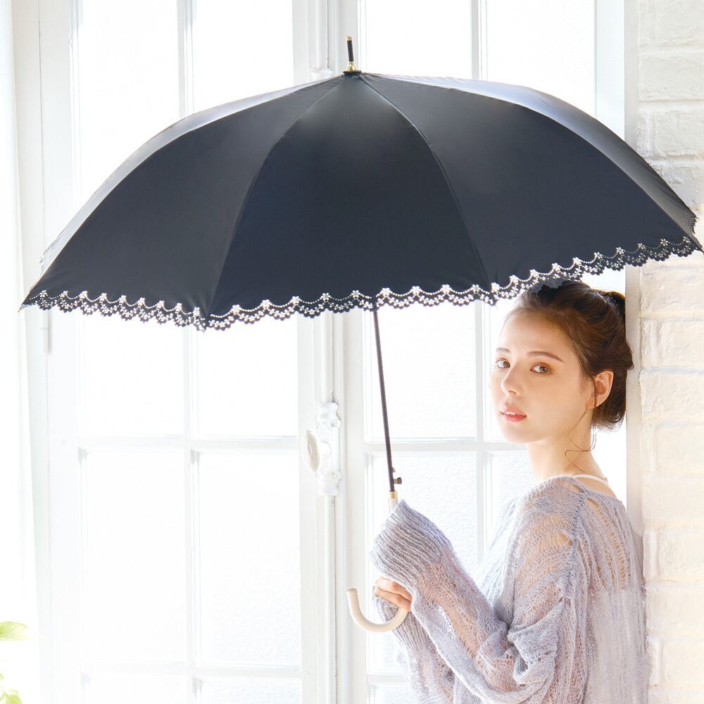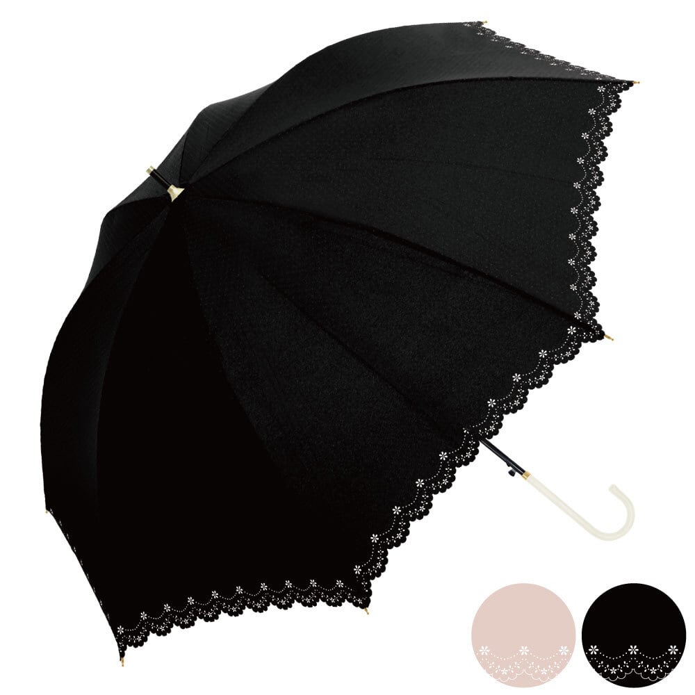 裾の花柄ヒートカットがかわいい、シンプルで上品なデザインです。58cmの大きめサイズが日差しから肌を守ります。
