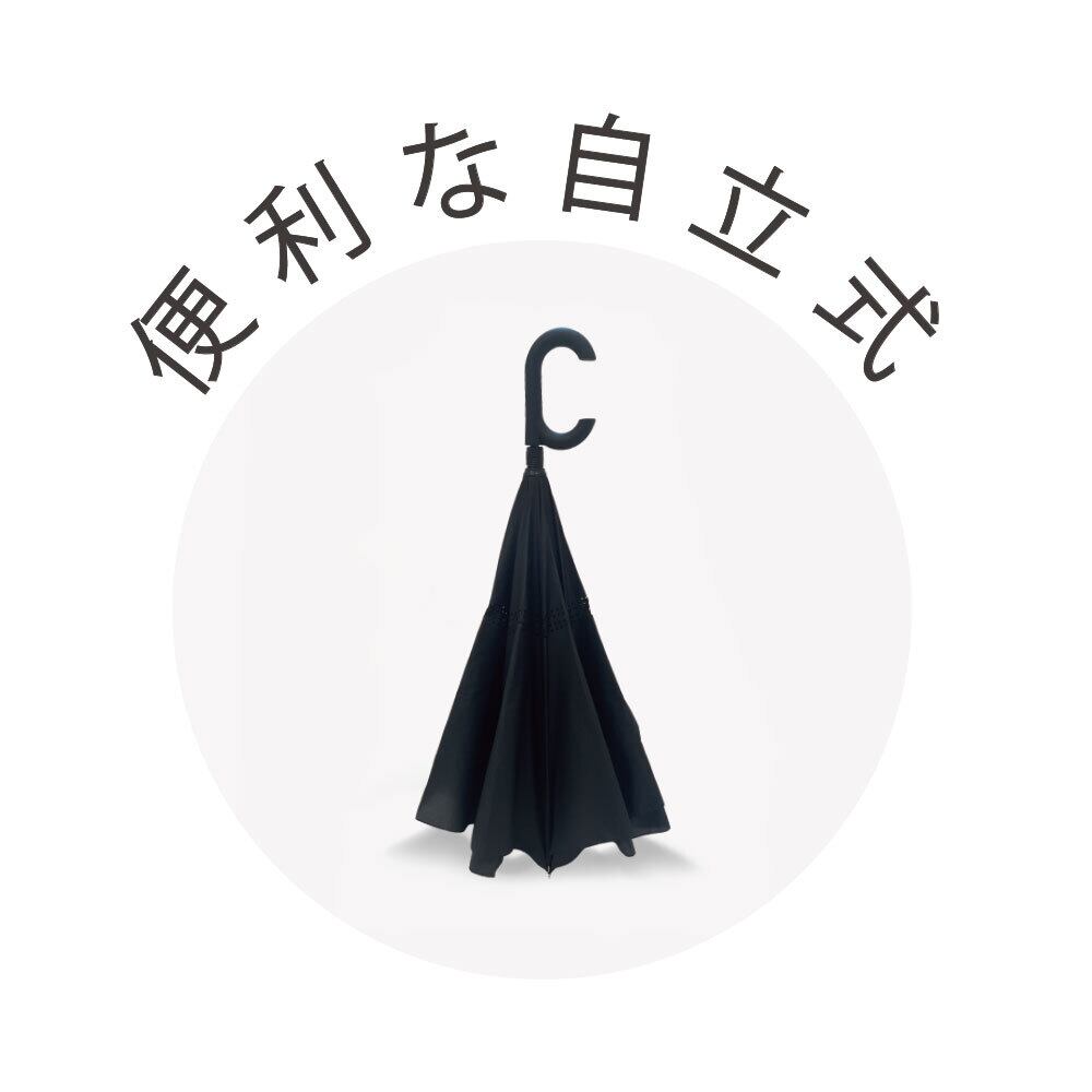 濡れた面が内側になるので服を濡らさず持ち歩き。車や電車での使用におすすめです。閉じた時に自立するのでサッと立てられます。
